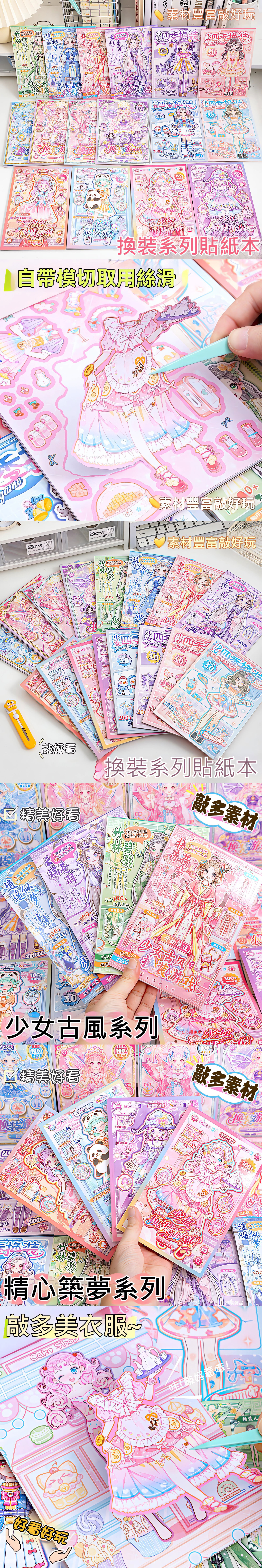 【DIY 公主遊戲換裝貼紙】 專為熱愛美感的小設計師打造!每本內含 12 個精緻主題場景 與 6 大張豐富貼紙,從甜蜜午茶到仙氣古風,讓孩子在指尖上完成一場場華麗的變裝秀,開啟專屬的夢幻冒險!